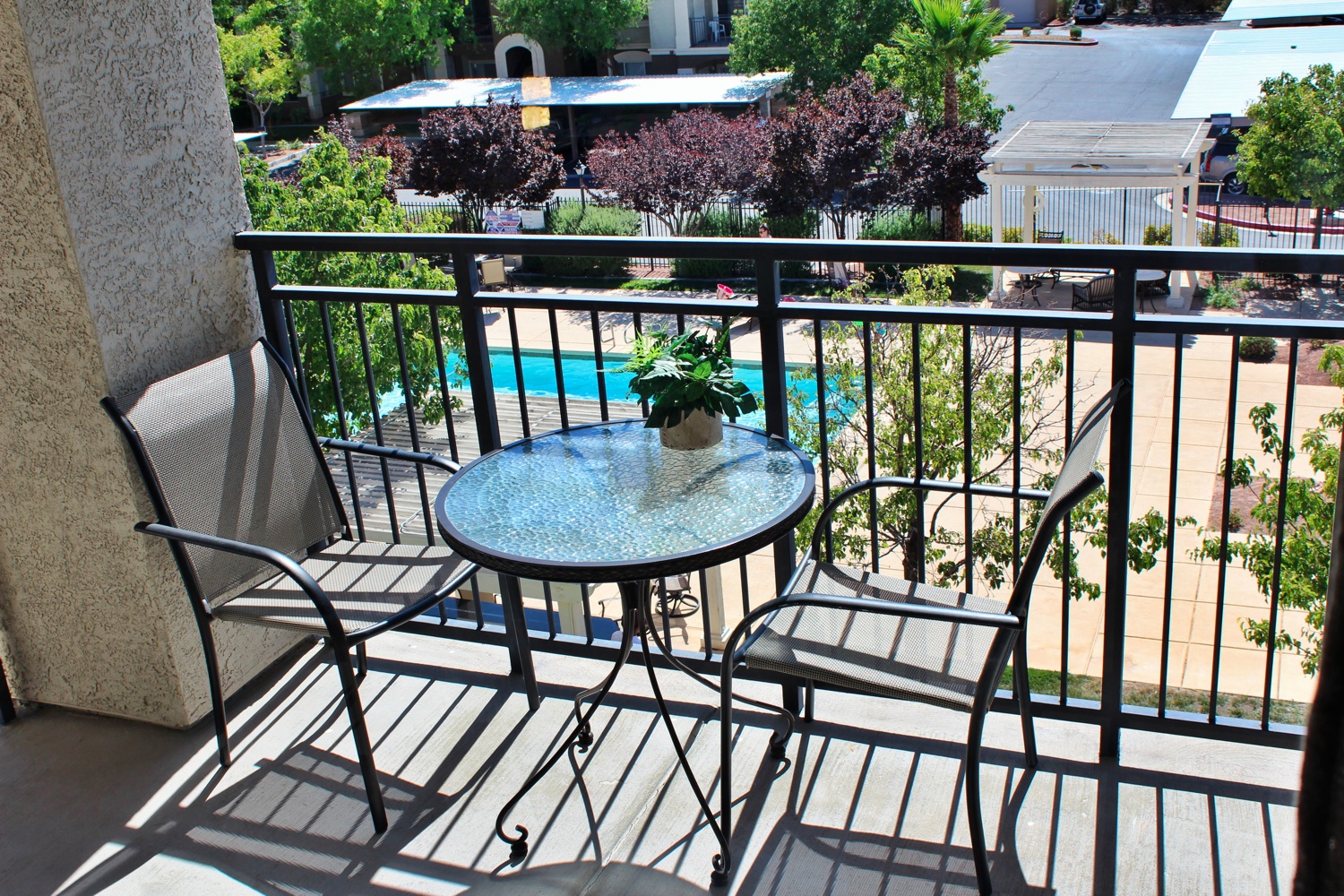 This top floor 1-bed/1-bath has a great open and spacious floor plan. Enjoy the light hardwood flooring, dark granite tops, and a spacious kitchen, complete with stainless steel appliance and a breakfast bar for entertaining. The bedroom is bright and beautifully decorated, furnished with a king sized bed and small desk, perfect for any traveling professional. Relax and unwind on your very own private balcony overlooking the pool with gorgeous views of the Las Vegas Valley, surrounding Red Rock Mountains, and the entire city skyline!
