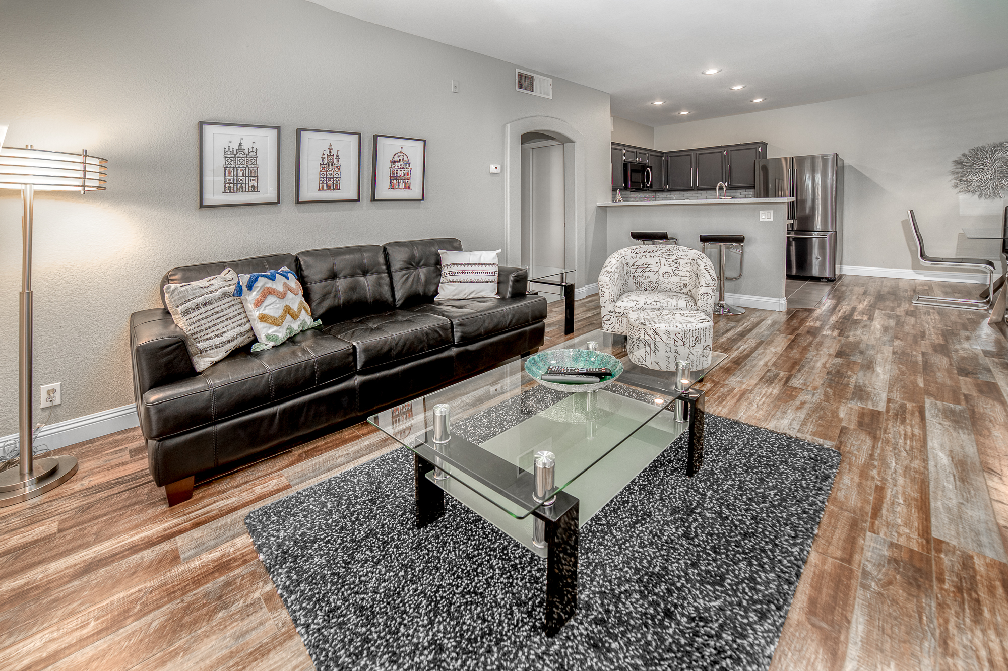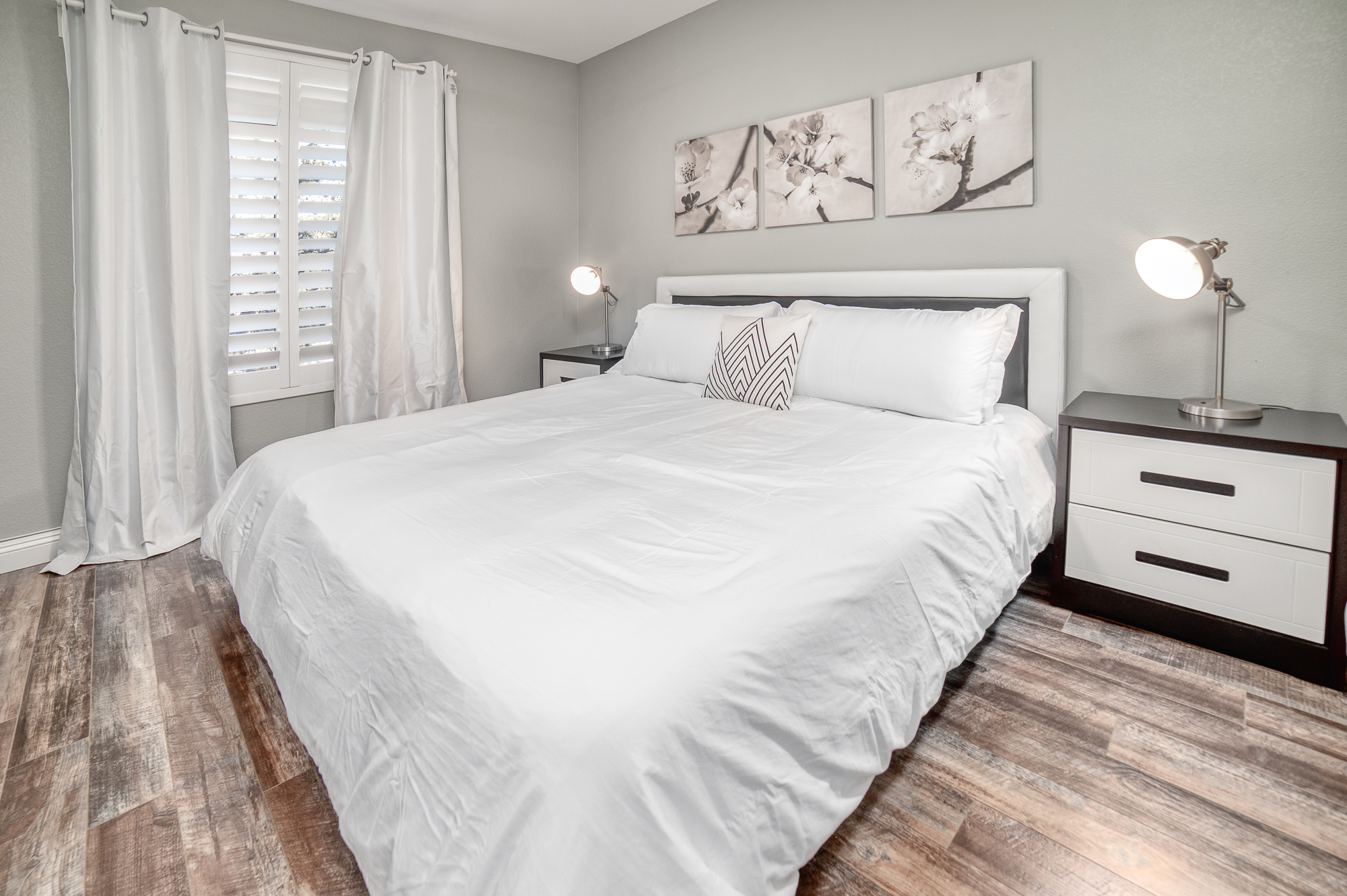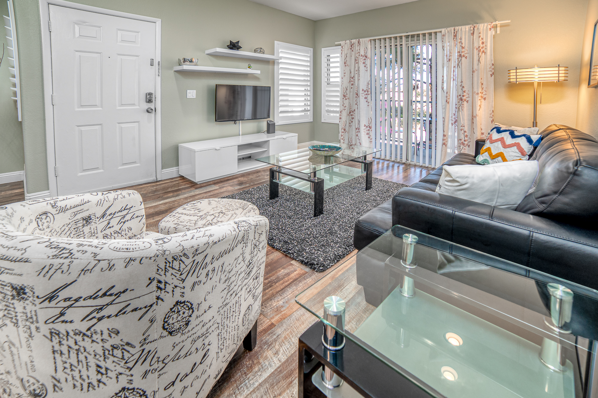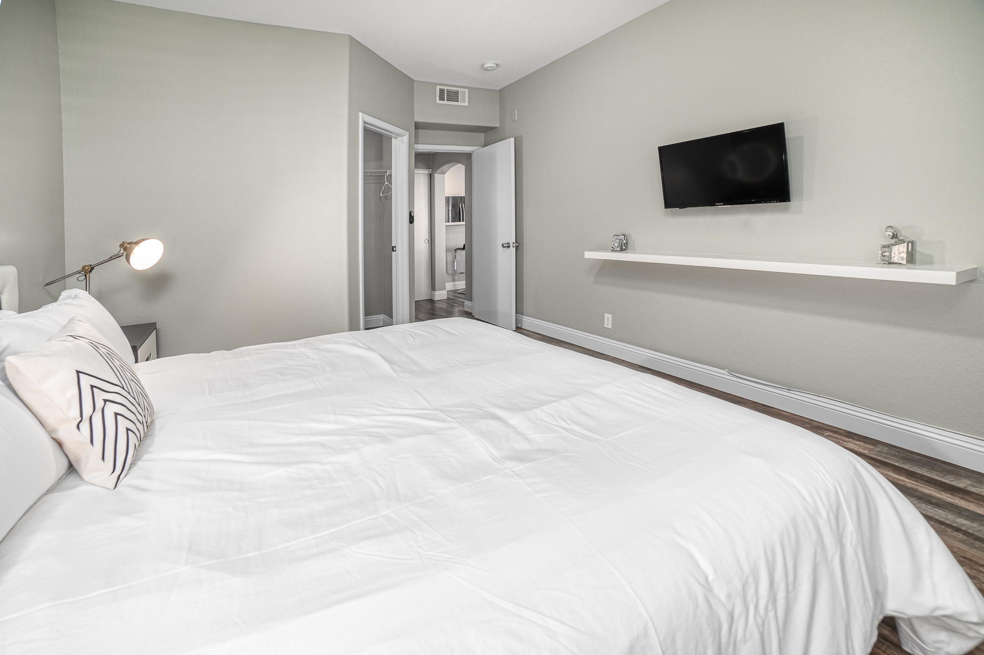 The interior of this gorgeous top floor 1-bed/1-bath is modern, yet comfortable with hardwood floors in the living room and bedrooms, tile flooring in the kitchen and bathrooms, and a spacious kitchen complete with a breakfast bar and stainless steel appliances. The master bedroom has a king sized bed which includes a TV. Fully furnished with housewares, kitchenware, linens and towels. There is also separate laundry area equipped with full sized washer and dryer. All the utilities are conveniently included in the monthly rate, along with WIFI Internet!