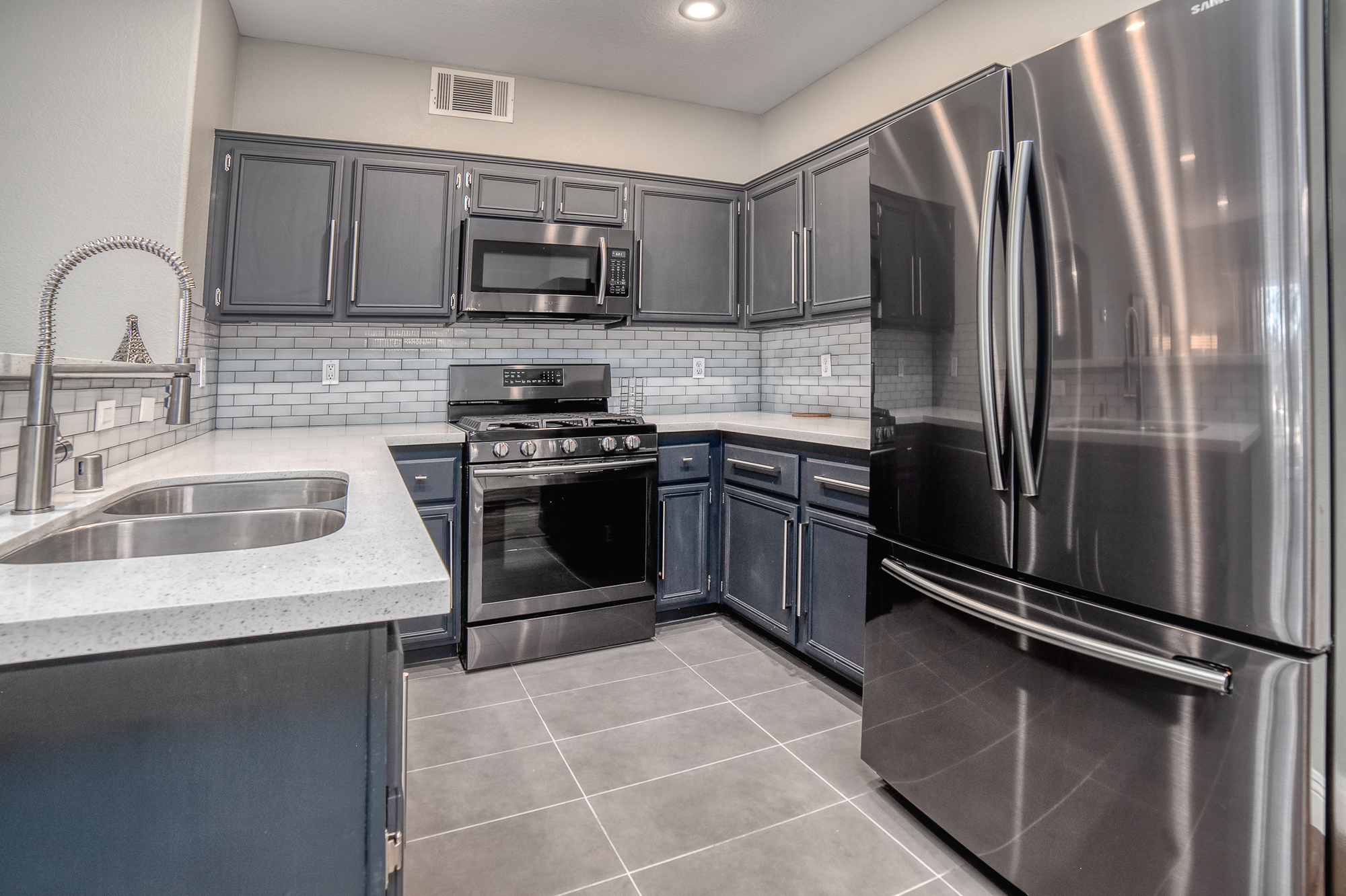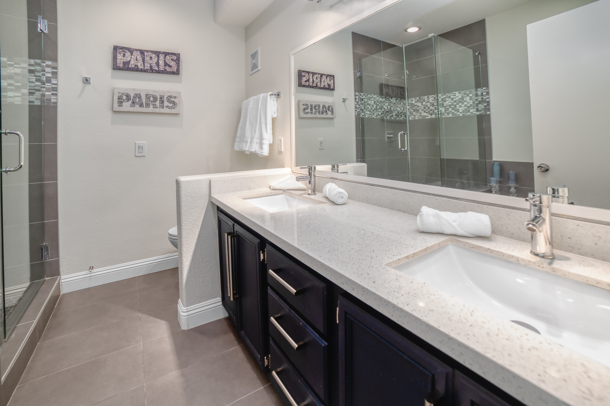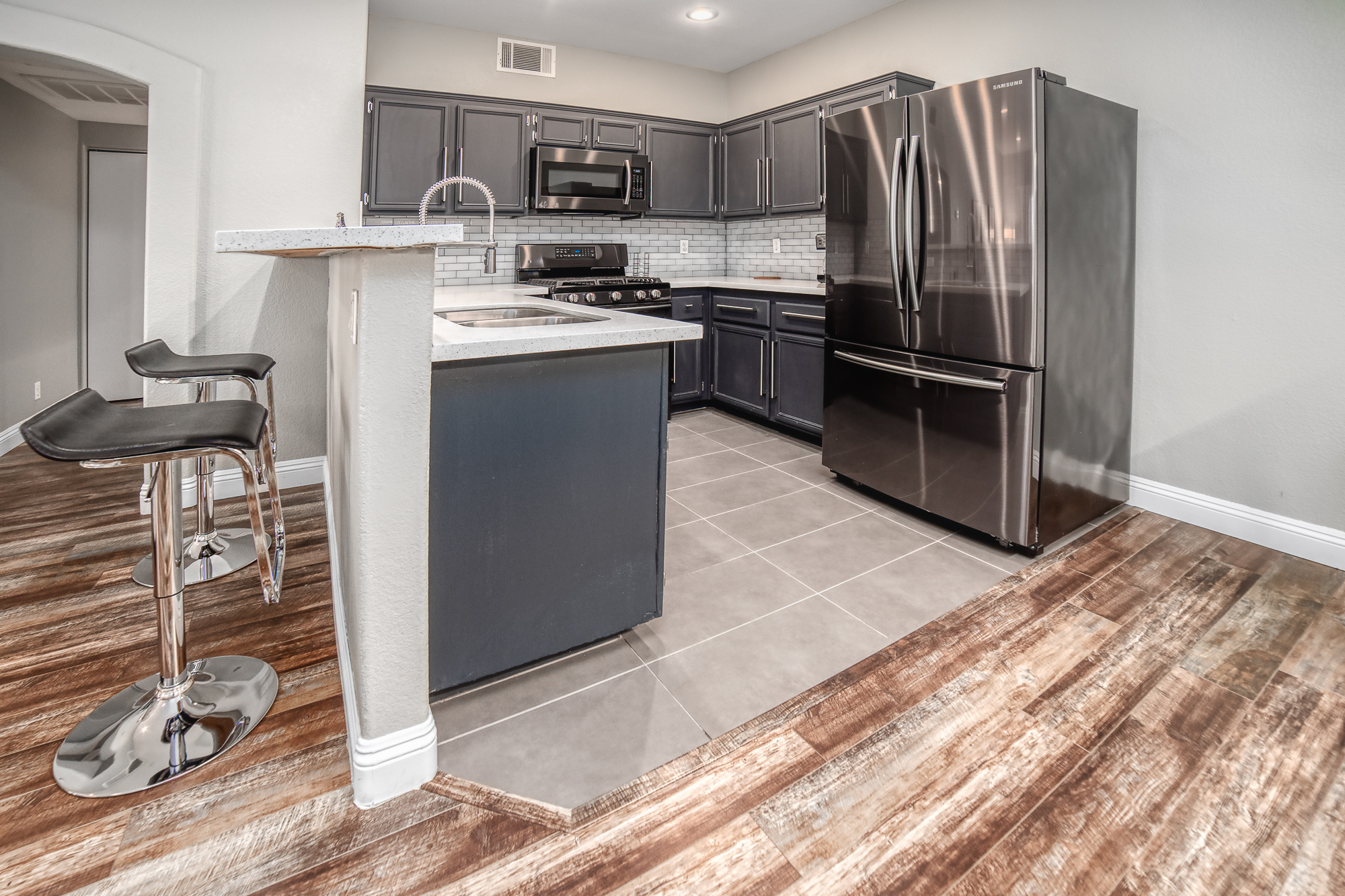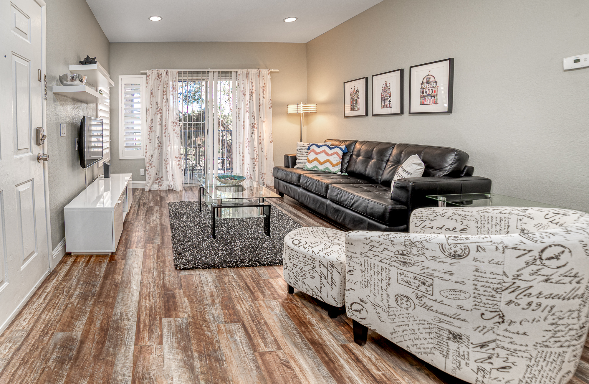 The interior of this gorgeous top floor 1-bed/1-bath is modern, yet comfortable with hardwood floors in the living room and bedrooms, tile flooring in the kitchen and bathrooms, and a spacious kitchen complete with a breakfast bar and stainless steel appliances. The master bedroom has a king sized bed which includes a TV. Fully furnished with housewares, kitchenware, linens and towels. There is also separate laundry area equipped with full sized washer and dryer. All the utilities are conveniently included in the monthly rate, along with WIFI Internet!